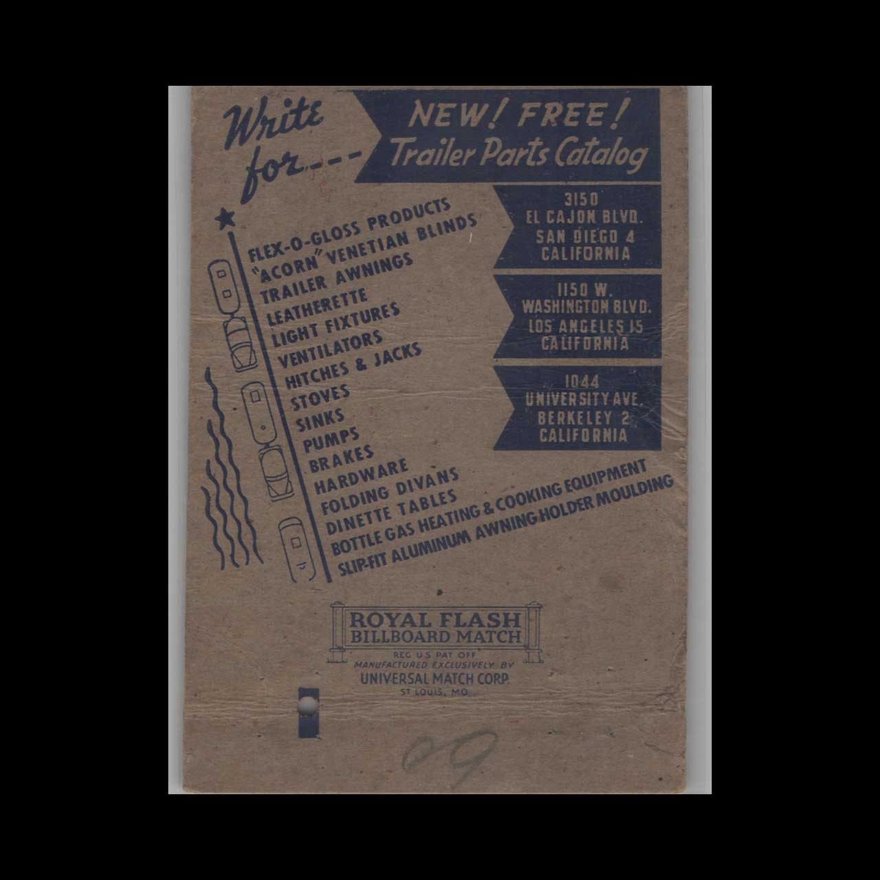 Wood Brothers Co specialized in trailer and coach equipment in Berkeley, CA, serving the mid-century American automotive industry. This vintage matchbook is a classic ephemera relic cherished by collectors of Americana.